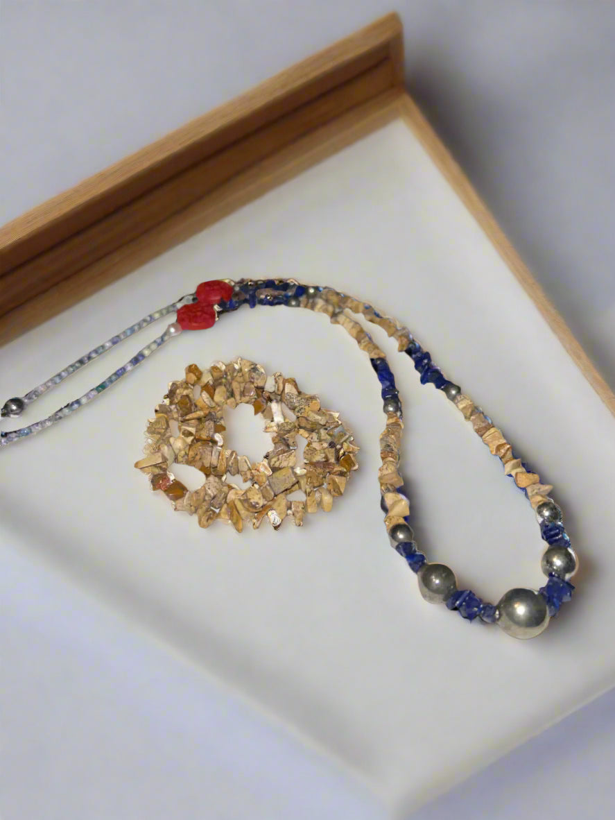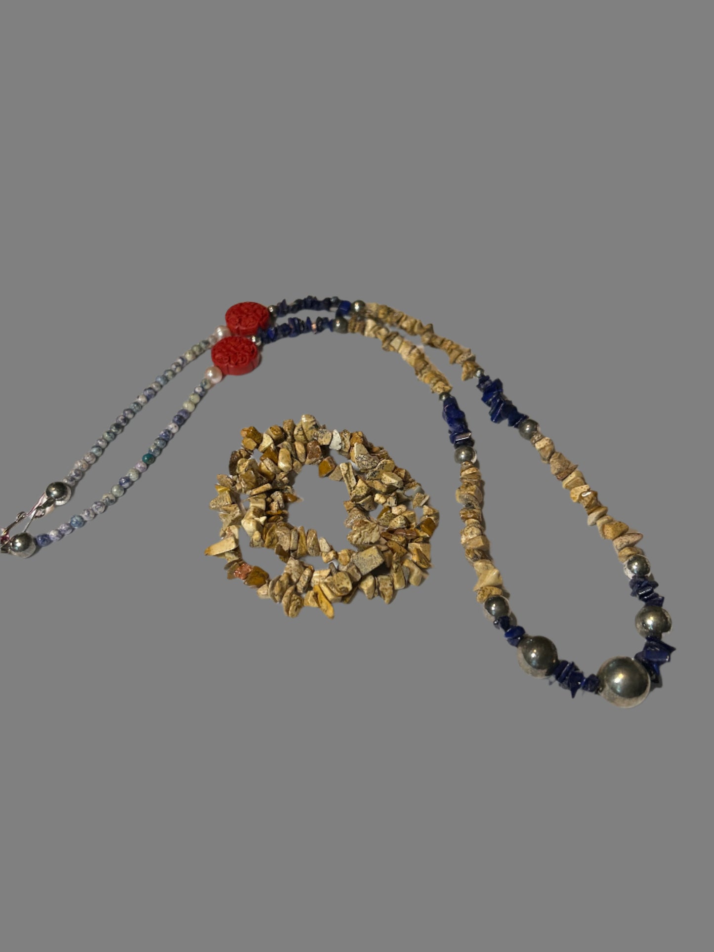 Beaded Blue & Tan Chip Red Cinnabar Necklace w/ Bracelet Set