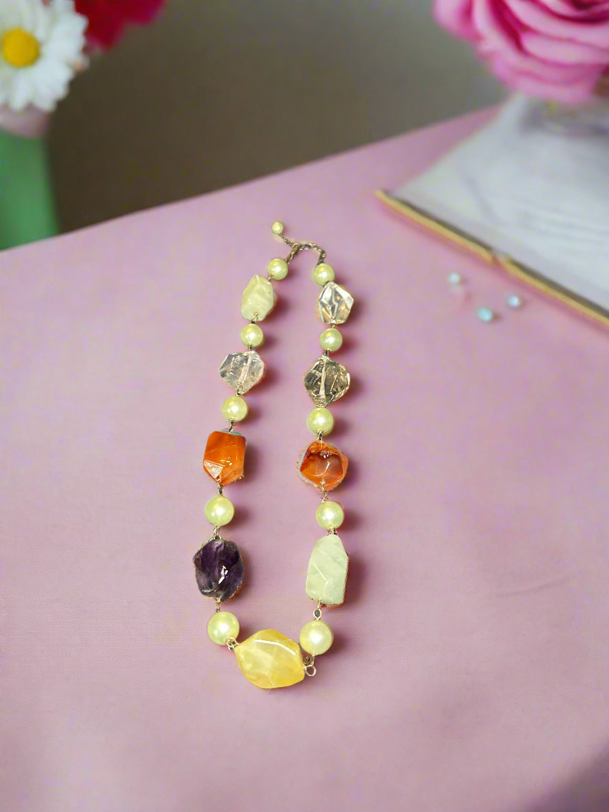 Get ready to add some color and shine to your outfit with this Multicolored Polished Gem Stones Necklace! Featuring a variety of gorgeous, polished gem stones in green, yellow, orange, purple& clear, this necklace will effortlessly elevate any look. Make a statement with this eye-catching accessory.