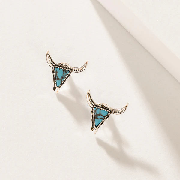 Express your fashion savvy with these striking steer skull stud earrings. Featuring turquoise inlay and antique silver detailing, these Southwestern-inspired pieces add just the right touch of boho charm to any outfit, from denim to sundresses.