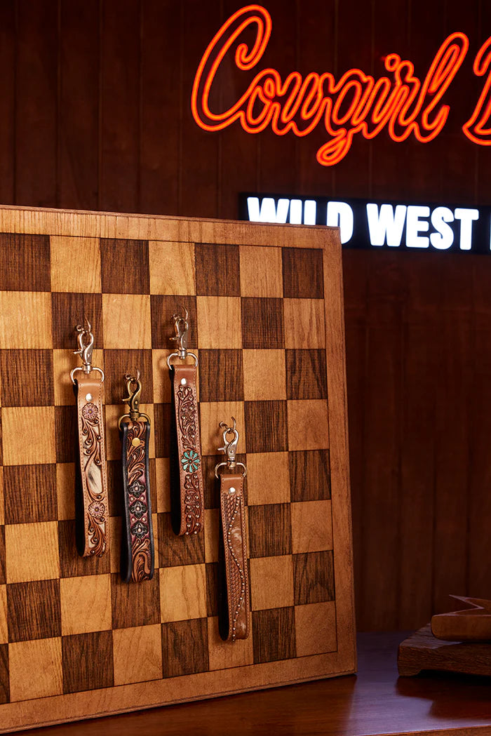 The Myra Spirit Stone Handtooled Leather Keyfob brings timeless Western artistry into a daily essential. Crafted from genuine leather, this western key fob showcases intricate hand-tooled patterns accented with turquoise stones, creating a rustic yet elegant look. Designed for durability, it keeps your keys secure while adding character to your everyday carry. Compact and stylish, this western key chain combines practical use with authentic craftsmanship, making it more than just a key holder.