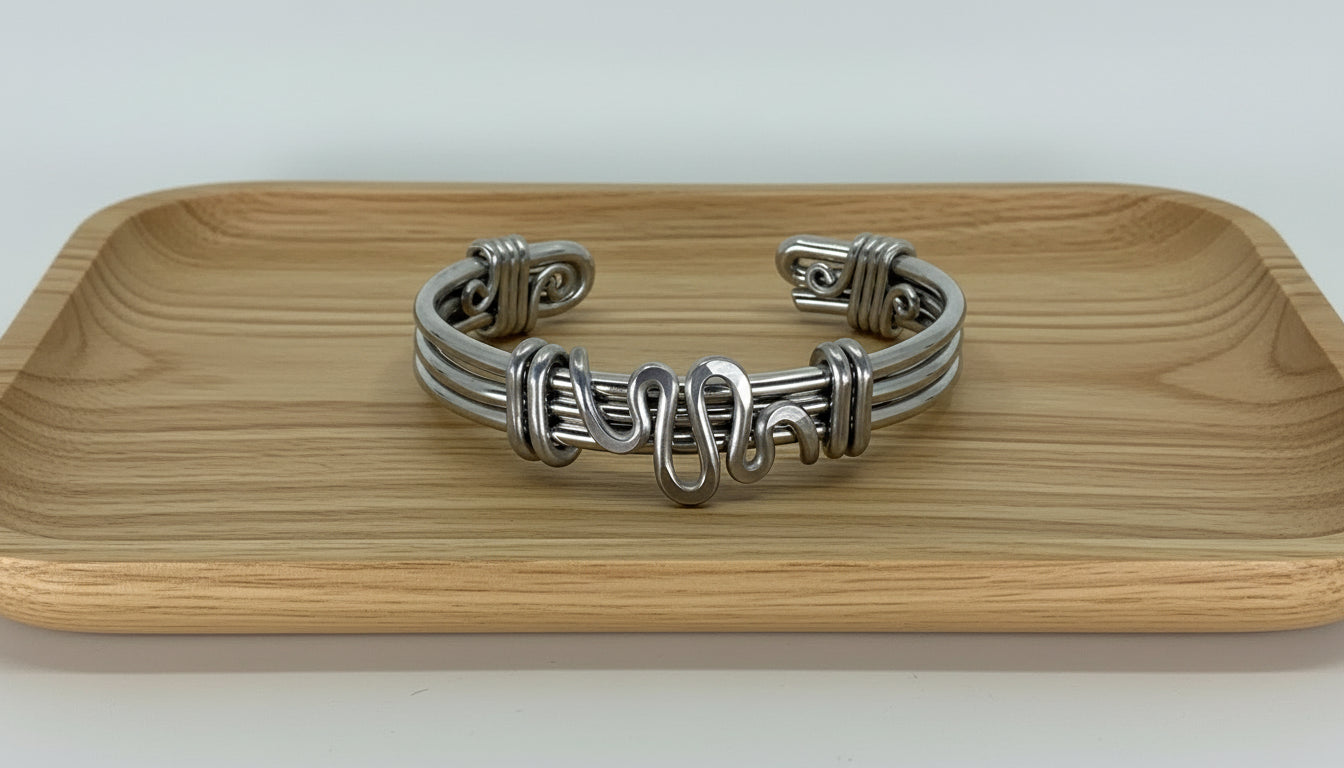 Crafted from recycled aluminum, the Squiggle Wristlet combines sustainable design with effortless elegance. No polishing required. Lightweight yet durable, this piece moves seamlessly from day to evening, offering a modern alternative to traditional accessories. Perfect for the conscious consumer who values both style and environmental responsibility. Made in USA.