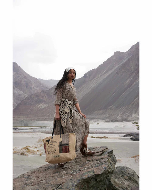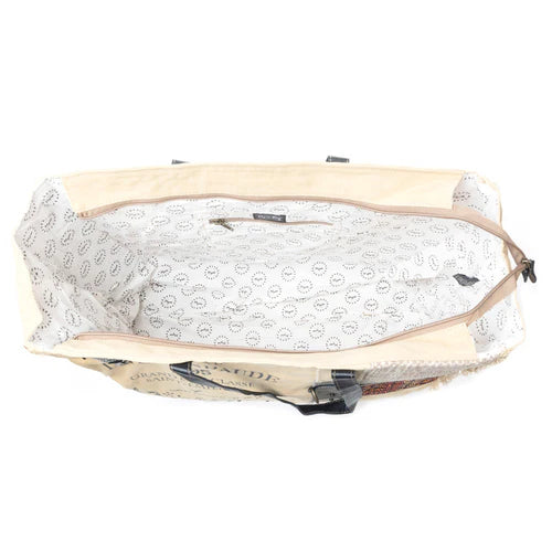 This spacious bag will carry your items in fun style! Its textured design features woven patchwork canvas, tribal upcycled woven rug in gorgeous colors, leather, and fanciful overprinting. Zipper-close top, canvas back with zippered pocket, and shoulder carrying straps in matching leather. An awesome bag!