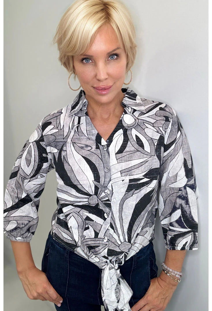 Effortless elegance meets everyday ease. This button-front top features a relaxed fit with just the right amount of drape—comfortable without feeling oversized. The front tie detail cinches at the waist for a flattering silhouette, while 3/4 sleeves and a versatile 25" length make it perfect for any occasion. Polished yet never precious, this piece pairs beautifully with everything from tailored trousers to your favorite denim.